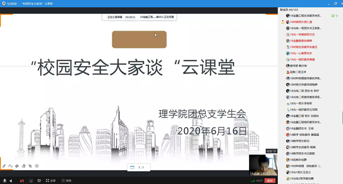 本次安全宣传活动与往日不同,采取全面线上的形式,上午10点,理学院团总支学生会通过开设网络云课堂的形式使同学们加入到“校园安全大家谈”主题讨论会中来,这不仅是同学们响应号召,凝聚共识的交流会堂,也是学习校园安全知识的第二课堂。本次讨论会针对责任落实、隐患排查、风险管控、应急处置、安全风险防范等内容展开积极交流。活动伊始,主持人林源涛简要介绍了校园安全教育方面的相关知识,通过生活实例形象地向同学讲述了校园周边存在的一些安全隐患和校园安全常识,使同学们认识到日常生活中防患于未然的重要性和生命的脆弱与可贵,及时地为同学敲响了安全的警钟。而后播放了生活中具有代表性的校园安全教育视频予以同学观看,视频中对多种安全问题做出了详细的介绍,各位参会成员认真观看安全教育视频并对其发表感想。