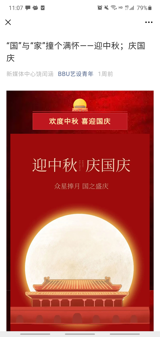同时,艺术设计学院团总支利用微信、微博、QQ等新媒体平台编发“小我融入大我、爱国从爱校开始”、“我与国旗同框”、“祖国,我想对你说”等多条主题报道,全院团员青年积极参与转发互动,共同歌颂祖国伟大成就、祝福祖国繁荣昌盛。(撰稿:翟天然;编辑:黄灿;审核:杨安升)