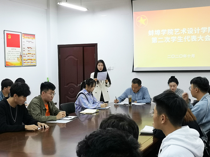 2020年10月20日,蚌埠学院艺术设计学院第二次学生代表大会在艺术设计学院会议室成功举行。大会由董曼洁同学主持,艺术设计学院党总支书记李道亮、团总支副书记翟天然出席大会。31名正式代表,20名列席代表参加了大会,大会顺利地通过了各项议程。