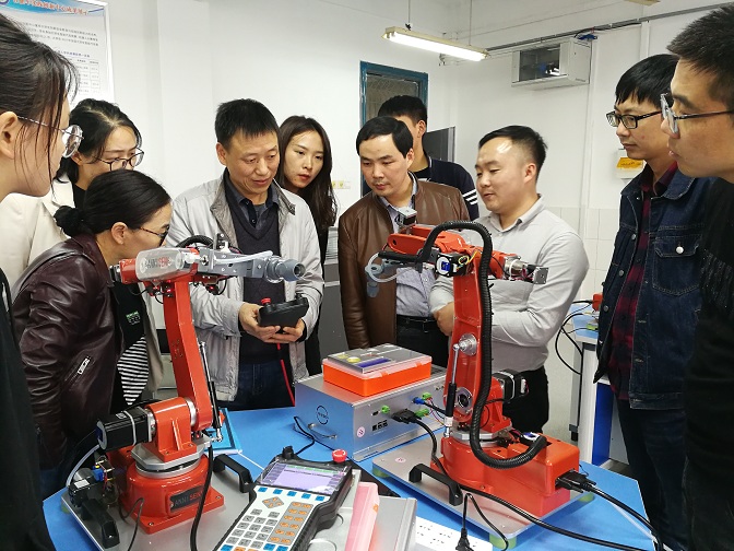 在为期两天的培训中,公司技术人员介绍了工业机器人的技术发展、行业应用、机械结构、示教编程、离线仿真等专业知识,同时讲解演示了六轴工业机器人的设备性能、应用方法及注意事项。参培师生认真聆听、虚心请教、积极实践,完成了工业机器人多点间的直线运动和弧线运动、工件坐标系下的涂胶等实验,取得了良好的培训效果。院长王艳春也多次到培训现场,了解新设备性能及功能,并与公司技术人员就工业机器人新技术发展、机器人工程专业课程体系设置、实践教学开展等,进行了深入交流。