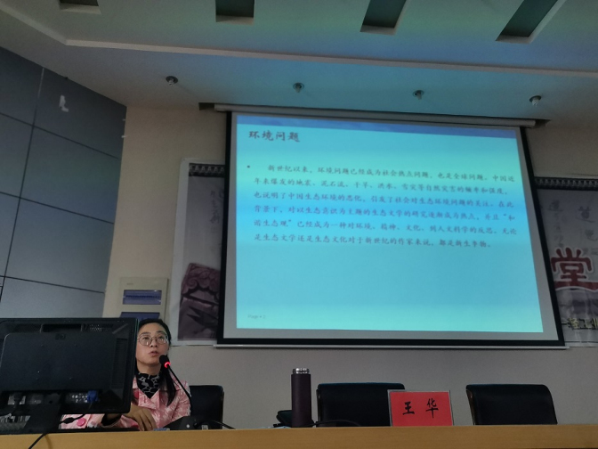 讲座内容分为三个部分。王华老师首先指出了新世纪以来,环境问题成为社会热点问题,也是全球问题。接着,王华老师就生态文学与生态文化、新世纪生态小说创作现状以及在生态文学基础上对现代文化的反思问题进行了讲解。其次是对现代自然观进行了反思。就批判现代人类中心主义自然观、作家反思人类对自然的改造、人类精神与自然生态之间关系的反思、反思人类与动物的关系进行阐述。三是阐释了传统生态文化的现代价值问题。最后王华老师对于今天的讲座进行总结,呼吁同学们重视生态环境问题。