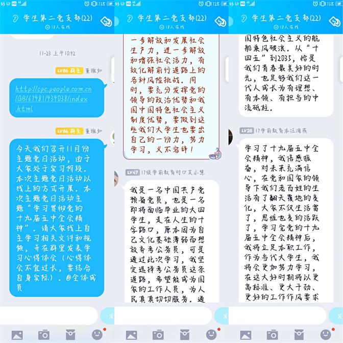 连日来,文学与教育学院学生第一、第二、第三党支部把深入学习贯彻五中全会精神作为理论学习的重要工作积极推进,观看新闻发布会、视频,解读“学习强国”文章,学习形式丰富多样。为了促进党员们的集中学习与交流讨论,三个学生支部分别于11月27日、30日及12月2日开展了“学习党的十九届五中全会精神”党日活动,讨论作为学生党员应该如何贯彻落实五中全会精神,各支部全体党员参与了此次活动,并发表自己的学习感想。
