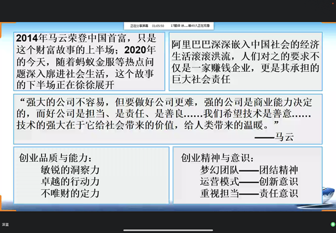 讲座以阿里巴巴为例,从公司在美成功上市成就互联网时代创业传奇为切入点,通过系统梳理创始人马云个人的成长经历、创业集体的形成过程,以及阿里巴巴创立及成长过程中的平台创新、业务创新等,以抽丝剥茧的方式和同学们一起领会阿里巴巴的运营特点和创业逻辑。赵睿形象地将酷爱武侠的马云比作网络经济“江湖”的“剑客”,和肝胆相照的“同门豪杰”,挥舞着“独立管理权”的“独孤九剑”、修炼着“多种业务独立运营”的“紫霞神功”,铸造了阿里巴巴这个泛舟网络经济蓝海的“巨型航母”。讲座通过具象的公司成长故事,讲述其折射出的创业者敏锐的洞察力、卓越的行动力和不唯财的定力,强调了作为成功的创业者必须具备的创新意识、团结精神和责任意识;鼓励同学们在未来的职业生涯和即将到来的毕业实习中,要将规则意识和创新意识相结合,做创业和就业路上的有心人。