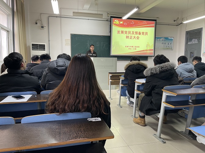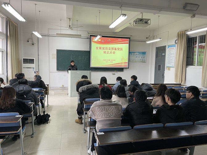 2020年12月9日,机械与车辆工程学院学生一支部在B121教室召开党员发展和预备党员转正大会,讨论陈雨生等8位同志的党员发展和张黄河等4位预备党员的转正工作,会议由学生党支部书记郭晶晶主持。