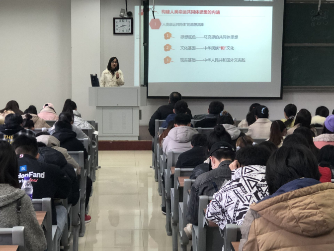 本次公开汇报课由新进教师王一主讲,王一老师以“构建人类命运共同体思想的内涵”为主要内容,从思想底色、文化基因和现实基础三个方面探寻“构建人类命运共同体思想”的思想渊源,从政治上、经济上、文化上和生态上阐释“构建人类命运共同体思想”的核心要义。