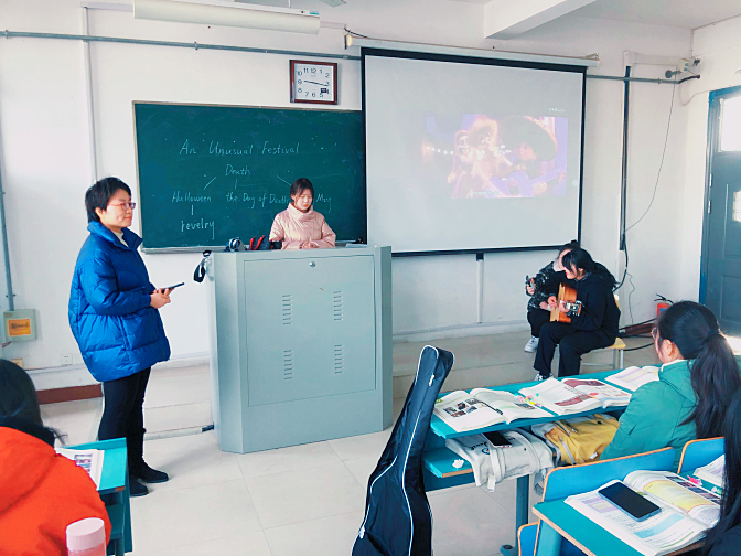 一是提升学生跨文化思维和意识。本次公开课的主题是“unusual festival”(不同寻常的节日),汪静老师将美国的Halloween(万圣节)、墨西哥的Day of the Dead(亡灵节)和中国的清明节进行跨文化对比,引发学生对于生命意义的哲学思考。