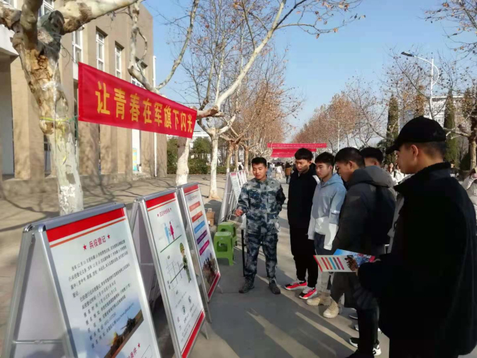活动现场设立征兵咨询处、悬挂横幅标语、设置宣传展板、发放宣传手册。活动宣传内容包括:征集对象、报名条件、征集流程、发展前景、经济补偿、学业安排、学历升级和就业保障等参军事项和入伍优惠政策。现场工作人员与学生亲切交流,回答学生提出的报名、体检、政审、学费补偿、学籍保留等问题,向学生发放1000余份宣传资料。八一社团退役学生面对面向同学们介绍了在部队的成长经历,让大家更直观感受军营、了解军营,鼓励他们踊跃报名应征,建功军营,报效祖国。在活动中,陆续有多名学生应征报名,表示要主动接受祖国挑选,到祖国最需要的地方去,到部队成长成才,为国防和军队现代化建设奉献青春。
