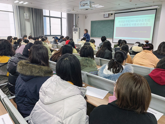 为规范本科生毕业论文和实习管理工作,确保毕业论文和实习的质量,外国语学院于12月18日举办了英语专业、翻译专业2021届本科生毕业论文师生见面会暨实习就业动员会。外国语学院全体2021届本科毕业生和论文指导教师100余人参加了本次师生见面会暨实习就业动员会。