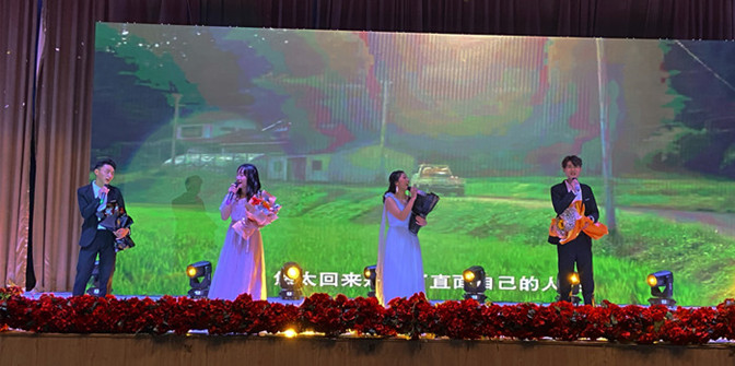 当指尖在琴键上流动的时候,美妙的音符犹如九天之上的银河,璀璨夺目却又缓缓地流淌进了观众的心中,此时远处飘渺的歌声也徐徐地走来。查蕾同学的一曲《大鱼》直接带动全场哼唱,歌至高音处,惊叹声和感叹声响彻整个观众席。紧接着就是扣人心弦的颁奖环节,党总支书记程志龙,一轻校副校长方军、副校长李青云、纪委书记韩永国来到舞台中央为“迎新杯”篮球赛、“迎新杯”羽毛球赛获奖的同学们颁奖。沉甸甸的奖杯奖牌凸显同学们奋力拼搏的收获,熠熠生辉的荣誉证书更是学院全方位培养高校人才的见证。