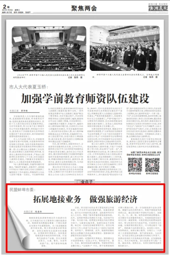 盟员崔晓峰老师执笔撰写的《关于常态化疫情防控下蚌埠地接旅游市场持续做大做强的提案》,作为民盟蚌埠市委的集体提案提交大会。针对蚌埠市地接旅游存在的主要问题,他建议要进一步落实政策的制定与执行,加强地接资源品牌塑造建设,拓展地接业务,做强旅游经济。
