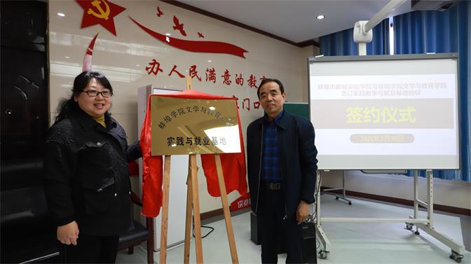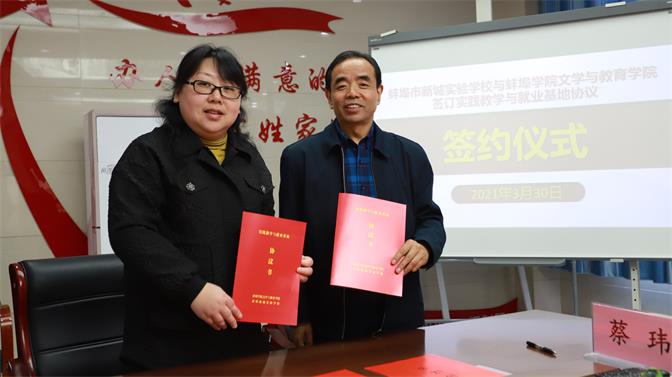 3月30日上午,文学与教育学院实践与就业基地签约授牌仪式在蚌埠新城实验学校举行。文学与教育学院院长吴长法、新城实验学校校长蔡玮代表双方签约揭牌。