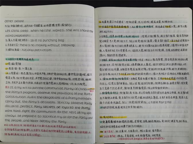3月26日-30日外国语学院分党校成功举办第32期党校培训班。为充分发挥党建的带动作用,引领学生在党课学习中扎实做到“知党史、学初心”,学院开展了“最美党课笔记”评选交流活动。活动以第32期党校培训班入党积极分子、发展对象及青马工程学员提交的笔记心得为评选对象,结合笔记内容、思考与笔迹、格式等,最终评选出6本优秀党课笔记,在学生群中进行展示与交流。