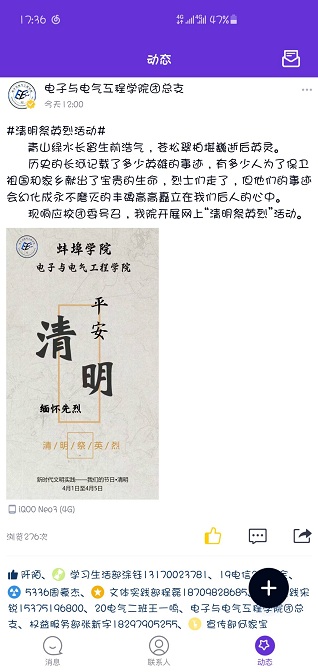 在清明节到来之际,为了追寻英雄的足迹,缅怀革命先烈,电子与电气工程学院组织学生开展了线上线下祭英烈活动。