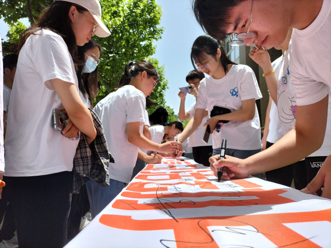 随后大学生心理协会会长张思同学向全体同学发布倡议:希望大家积极投身到“超越自我,感恩当下”心理健康教育主题活动中,在实践中构建更积极的自己,在活动中发现生活的美好。2019级心理委员卓丛丛同学代表全体心理委员积极响应活动号召:作为一名班级心理委员,我们是学校心理健康教育工作的宣传员和守望者,在学校心理健康教育体系建设中有着不可取代的作用,所以要充分发挥心理委员的朋辈助人力量去影响身边的人,在学校开展的心理健康教育工作中做好一名响应者、宣传者和组织者,营造和谐的校园心理文化环境。紧接着大学生心理协会成员为大家带来了朗读表演《当我真正开始爱自己》,响应了心理主题活动月的主旨,即倡导大学生学会自我关怀,珍爱自己的生命。最后同学们在“超越自我,感恩当下”的白色条幅上庄重的签上了自己的名字。