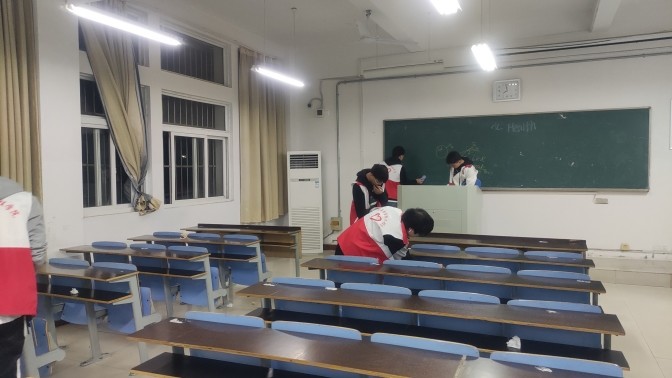 此次志愿服务活动以线上报名方式募集26名志愿者,活动当天志愿者在教学楼B楼大厅集合,负责人划分好服务区域和任务,志愿者们拿好工具纷纷投入到服务中。志愿者们对B、C教学楼的各个教室进行打扫,擦拭桌椅,整理讲台卫生及教室内公共设施的简单维护。