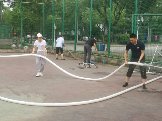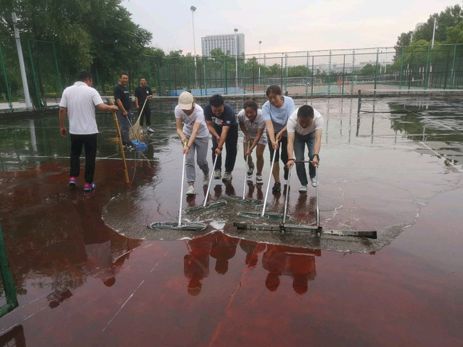 劳动现场,党员服务者个个精神抖擞,干劲十足,有的抱着大扫帚认真清扫球场卫生死角、有的拿着拖把深度清洁、有的拿着木棍逐一疏通下水道、有的始终拖着重重的水龙头清刷地面。汗水湿透了衣衫、脏水浸透了鞋子,党员们没有丝毫怨言,发挥吃苦耐劳和善于发现问题的精神,在如何排水、如何清扫成年的积尘和杂草中找到方法,去劳作,经过大家的共同努力,手球场、网球场面貌焕然一新,路过的学生纷纷点赞。