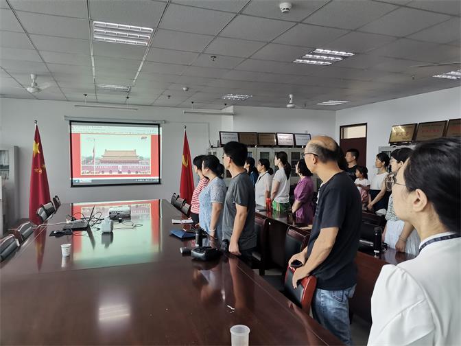 8点整庆祝大会正式开始,文教学院的党员教师和民主党派教师齐聚学院会议室现场观看。直升机护旗梯队护送党旗凌空驶来,拉开了飞行庆祝表演的序幕,天安门广场上的人民群众激动欢呼。会议室里,学院教师看着直播现场缓缓掠过天空的党旗与庆祝条幅,不禁发出热烈的掌声。随后,国务院总理李克强宣布大会开始,五十六门礼炮,鸣放一百响,致敬党的百年光辉历程。国旗护卫队迈着铿锵有力的步伐迎面走来,升国旗仪式开始。会议室现场的教师们纷纷起立,跟随着银幕中的画面观看升旗仪式。银幕里,鲜艳的五星红旗徐徐升起。会议室中,教师们神情专注,齐唱国歌,强烈的民族自豪感在现场弥漫,有的教师眼里泛起了激动的泪花。