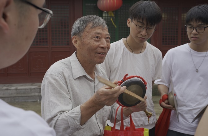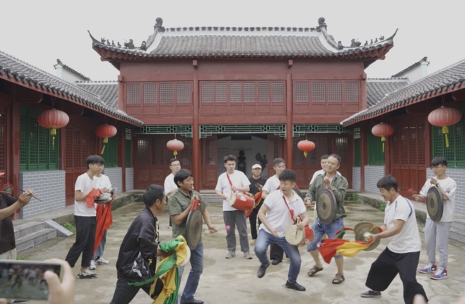 接下来迎来了活动的小高潮,当地的民间艺术家拿起锣鼓给同学们展示了一场别开生面、热闹非凡的演出,让同学们见识了原汁原味、原生态的花鼓灯艺术。民间艺术家们声情并茂的演出感染了现场的同学,同学们按捺不住,也拿起锣鼓把自己所学尽情展现出来,同学们和民间艺术家们的“斗舞”环节激烈展开。民间艺术家对同学们进行“一对一”指导,学生们收获了很多原生态的花鼓灯舞蹈动作、技巧。接下来一周内同学们将分批前来继续学习花鼓灯并与当地居民一起表演。