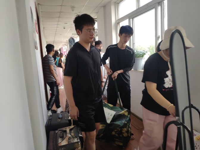 学院党员、入党积极分子自愿组成志愿者服务队,于6月30日进行培训,明确分工。7月1日早晨6点30分志愿者队伍集合,分成两组,根据分配的任务,进入学生宿舍开始搬迁工作。