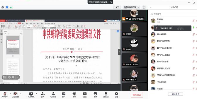按照《中共安徽省委组织部关于基层党组织召开党史学习教育专题组织生活会的通知》和《中共蚌埠学院委员会党史学习教育工作方案》要求,7月20日上午,电子与电气工程学院学生第一党支部于线上召开2021年度党史学习教育专题组织生活会,本次会议由支部书记刘亮主持,全体党员参会。