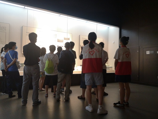 志愿者在工作人员的带领下参观了“蚌埠历史文化陈列”、“蚌埠市非物质文化遗产展”、“考古体验厅”等几大特色陈列。通过观看图片资料、历史文献、革命文物等博物小分队的9位成员们深刻领悟到了中国共产党秉持初心,砥砺前行的光辉历程,在重温历史中深入领会实践和使命的丰富内涵与时代意义。