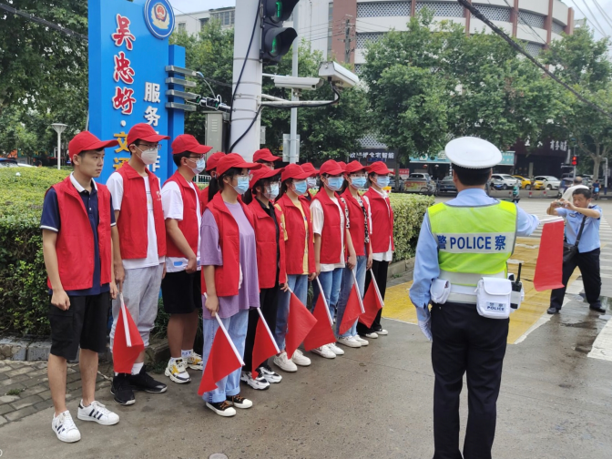 【乡村振兴 建设家园】“乡村振兴,建设家园”小分队积极响应号召,7月9号-11号在蚌埠市涂山路和工农路的交叉路口开展志愿服务活动。每天上午八点,队员按时到达目的地。交警大队负责人向队员们示范如何规范挥动红旗以及讲解每个动作的意思,反复提醒队员在保护自身安全的前提下维持交通秩序。由于该地邻近市中心,人流车流量巨大,队员三人一组有针对性的在人流量比较大的四个路口,进行站岗执勤。各队工作人员统一着装,身穿红马甲,右手持小红旗,在自己的岗位上挺直身板,克服天气炎热的困难,认真指挥交通,提醒行人注意交通安全,按照交通信号依次有序通过路口。活动过程中,有群众询问路况地址和车站,队员通过手机查询或询问本地人帮助群众解决问题。队员还积极搀扶杵着拐杖,腿脚不便的老人过马路,引导车流避让,并且及时规劝个别前轮超过停止线的非机动车主退回线里。本次实践活动在志愿者们的辛勤劳动下完美落下帷幕。