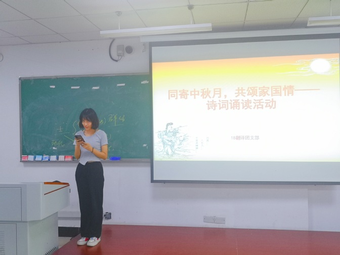 同寄中秋月,共颂家国情。学院开展“同寄中秋月,共颂家国情”的诗词诵读活动。徐晶仪同学为大家朗诵了一首唐代诗人张若虚的《春江花月夜》,她用抑扬顿挫的语调让大家感受到一种深沉,寥廓,宁静的境界。曹一凡同学朗诵了一首苏轼的《水调歌头·明月几时有》,这首词以月起兴,与弟苏辙七年未见之情为基础,围绕中秋明月展开想象和思考,把人世间的悲欢离合之情纳入对宇宙人生的哲理性追寻之中,反映了作者复杂而又矛盾的思想感情,又表现出作者热爱生活与积极向上的乐观精神。王思远同学朗诵了一首周作人的《中秋的月亮》,其中,“数千年来古人所瞻望所歌咏的就是这个月,而且这寒热得宜,桂子香飘的时节看这圆月,不是昨天或明天的所能比,也不是上月和下月的所能比的”这一段让大家对中秋节的到来更加兴奋。