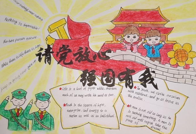 用色彩描绘中国梦:为认真学习贯彻习近平总书记在庆祝中国共产党成立100周年大会上的重要讲话精神,外国语学院团总支举办“请党放心、强国有我”手抄报大赛。全院两百多名学生参加此次活动。参赛同学精心策划,认真制作。同学们创作了一幅幅主题鲜明、图文并茂的精美手抄报。其中,车梦楠同学的手抄报表达了对祖国的热爱,也燃起了其他同学的爱国之心。