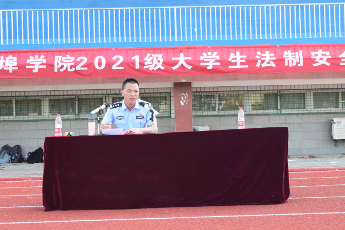 9月26日上午,学校在第一运动场举行2021级新生法制安全教育,蚌埠市公安局龙湖派出所所长陈兴武应邀前来授课,全体新生精神抖擞、士气高涨,以营为单位整齐地坐在运动场上聆听讲座,学生处副处长赵思莉主持讲座。