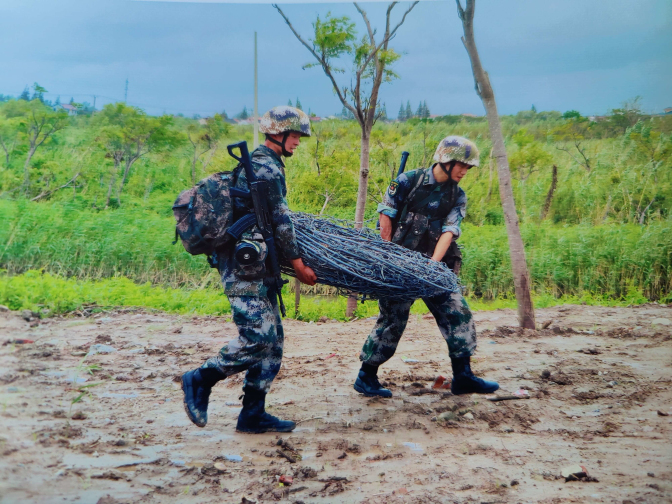 花瑞祥(左)和战友在训练中搬运障碍物