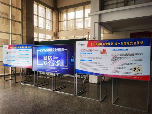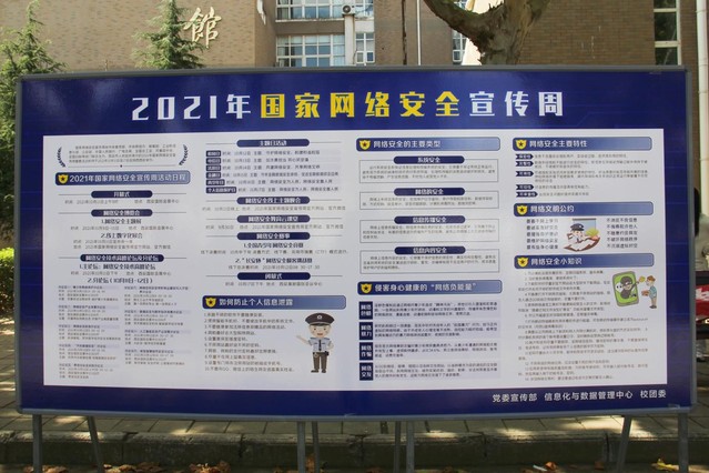 为营造网络安全人人有责、人人参与的良好氛围,2021国家网络安全周期间,党委宣传部、信息化与数据管理中心充分利用大屏幕、学院宣传板等校园媒体投放“国家网络安全宣传周”系列宣传板报、宣传标语,向广大师生普及了《网络安全法》、网络安全职责、个人网络安全意识口诀及小贴士等内容,向广大师生宣传介绍网络安全风险、如何防止网络诈骗、如何防止个人信息泄露等网络安全知识,营造全校人员共同参与网络安全周活动的良好氛围。