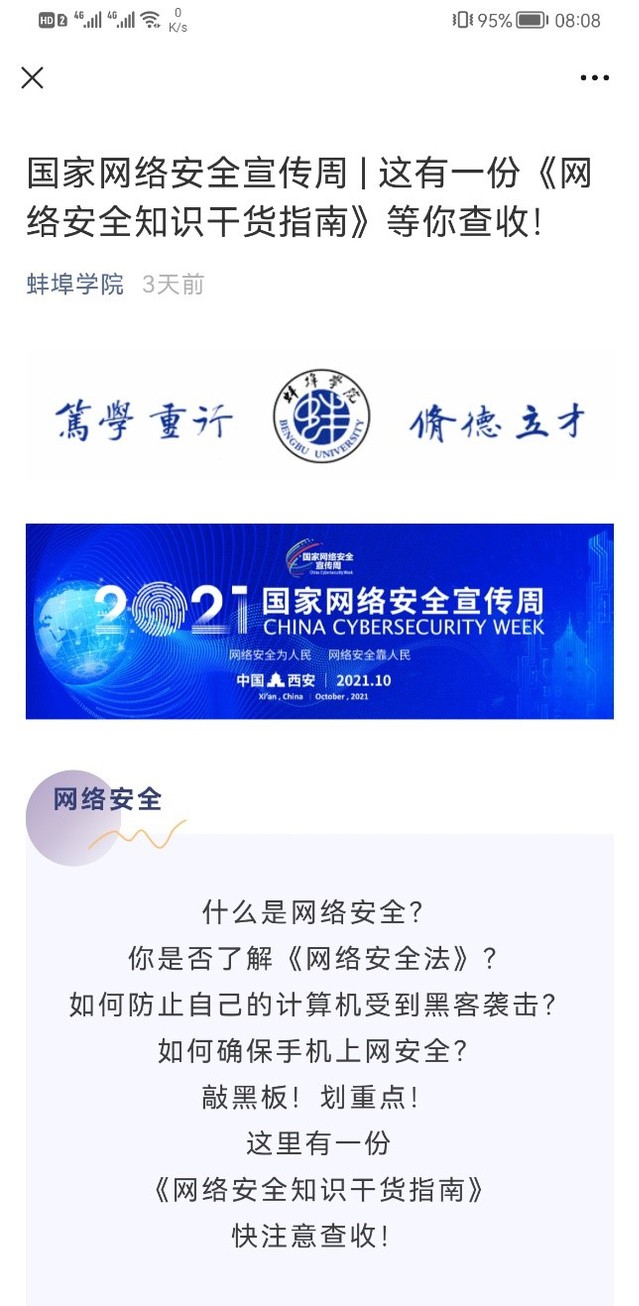 为深入学习贯彻习近平总书记关于网络强国的重要思想,按照《安徽省教育厅关于组织开展2021年网络安全宣传周活动的通知》(皖教秘[2021]364号)要求,我校于2021年10月11日至10月17日开展主题为“网络安全为人民、网络安全靠人民”的国家网络安全周系列活动。