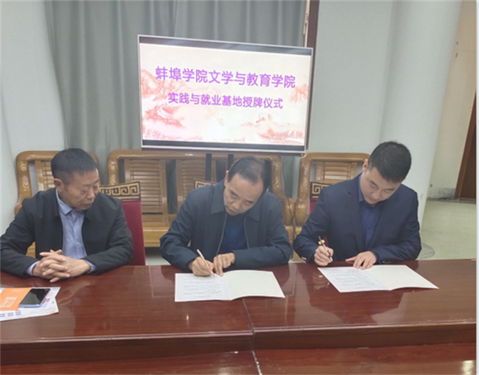 仪式开始之前,双方首先介绍了各自基本情况,吴长法介绍了蚌埠学院的基本情况、发展历程、办学特色以及文学与教育学院的人才培养体系特点、教科研优势,肖振宏介绍了行知高级中学的办学情况、办学特色和发展前景。随后,吴长法和王仕康代表双方签订了合作协议,为实践教学与就业基地揭牌。