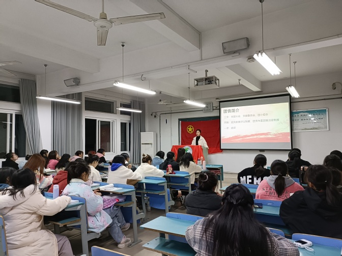 一次团情介绍。团支部书记黄妍带领同学们具体学习团史团情、温习校史校情,学习“三会两制一课”、团员发展细则和团费收缴使用管理规定等,让同学们深入了解共青团发展历程,明确身为团员要遵守的规章制度。