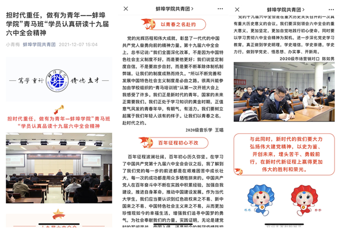中国共产党第十九届中央委员会第六次全体会议召开以来,共青团蚌埠学院委员会组织青年师生、团学干部阅读研习公报全文、交流学习感想,撰写记录心得体会,持续掀起学习党的十九届六中全会的精神热潮。