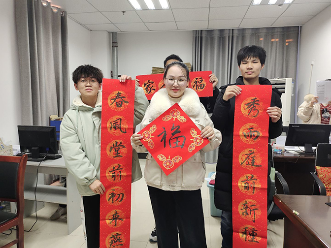 此次艺术设计学院团总支组织书法协会为广大师生写春联、送福字,不但是送上新春的美好祝愿,更是传承优秀传统春节文化。希望通过这种形式,让广大师生感受书法的艺术魅力,营造出喜迎新年的祥和气氛,也为书法协会的学生提供一次学习实践的机会。(撰稿:翟天然;编辑:黄灿;审核:杨安升)