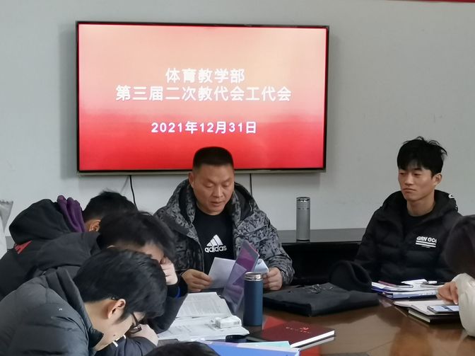 在全校深入学习贯彻党的十九届六中全会精神之际,2021年12月31日下午,体育教学部第三届教代会第二次会议在部会议室召开。会议由体育教学部工会主席苏绍会主持,全体教职工参加了会议。
