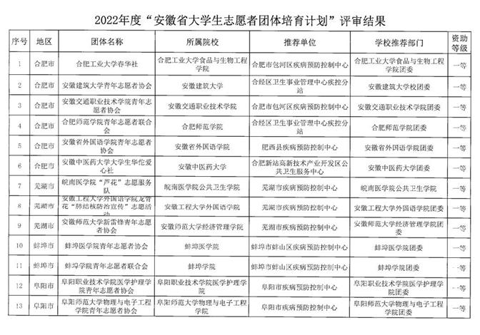 近期,我校青志联青年志愿者联合会荣获2022年度安徽省大学生志愿者团体培育计划一等资助。该计划由安徽省结核病防治研究所主办,是“安徽省百千万志愿者结核病防治知识传播活动”的一部分,2022年全省共计82个大学生志愿者团体入选培育计划,经过申报、专家评审和网上公示,我校青年志愿者联合会脱颖而出,喜获一等资助。