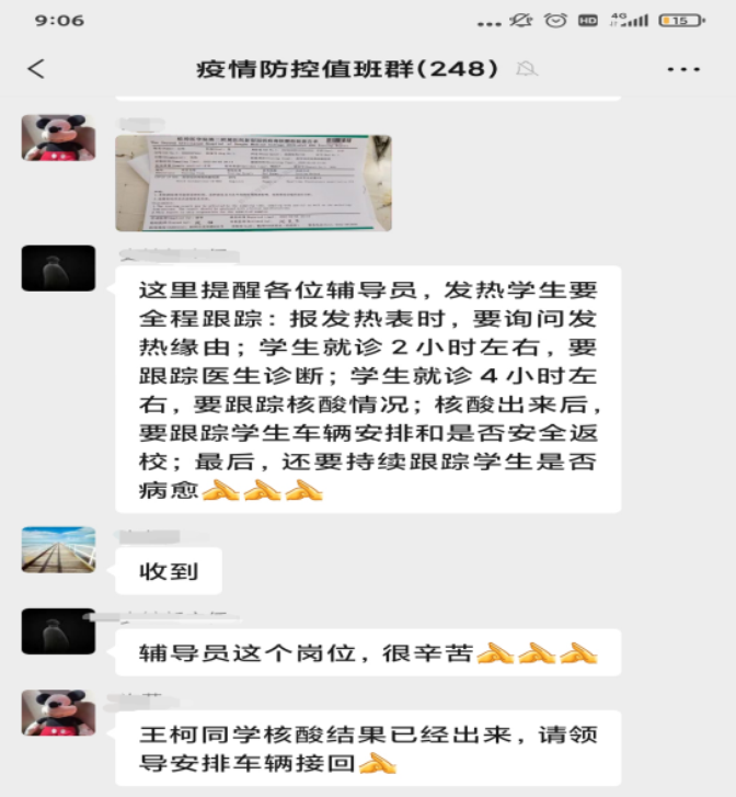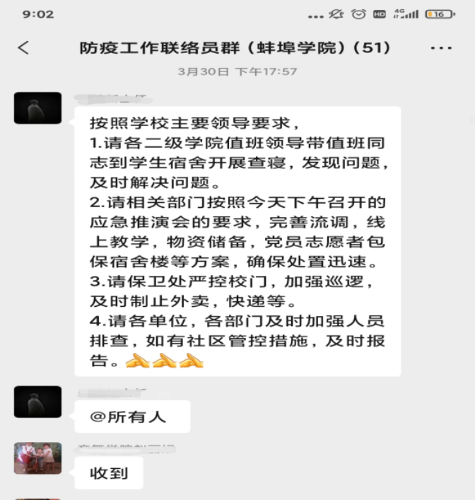 小小微信群,集结大能量。为务实高效做好疫情防控工作,学校建立微信工作群组。防疫联络员群内,51位防疫联络员每天第一时间将疫情防控相关政策、通知、新闻传达转发给各单位师生员工,及时开展信息摸排汇总。他们既是政策联络员,又是数据统计员,还是信息交通员,也是报告速递员、落实督察员。疫情防控值班群内,每天由一名校领导带班,处级领导干部、学工、后勤、保卫、医疗骨干共同组成值班小组,全天24小时在线,及时处置学校、学生出现的突发情况,如学生生病发烧、宿舍停水、停电等问题,均能第一时间得到回应处置。