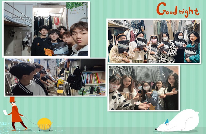学院通过学生在寝室即时拍照的方式查看同学们的夜间归寝情况。一幅幅花样有趣的照片,一张张记录着同学们按指定口令拍摄的图片,既展现出“小家”的团结,也推动“大家”的温馨。