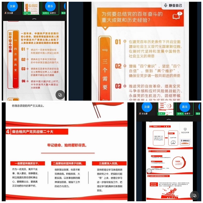 全体学生党员首先深入学习了党的十九届六中全会精神。学习讨论中,大家纷纷表示,将深入学习领会全会精神,不忘初心、砥砺奋进,以榜样为标杆、传承榜样精神,以更高的要求鞭策自己,提高自身能力,不断充实自我,充分发挥党员先锋模范作用,主动承担历史赋予当代青年的责任,在学习创新中不断取得新的更大的成绩,为实现中国梦奉献出力所能及的力量,以优异成绩迎接党的二十大召开。学生党员张梦伟表示:“回望党的发展历程和伟大成就,我们深受鼓舞,每一位党员都要在新的征程中凝心聚力、奋发有为,做出新的更大的贡献。”