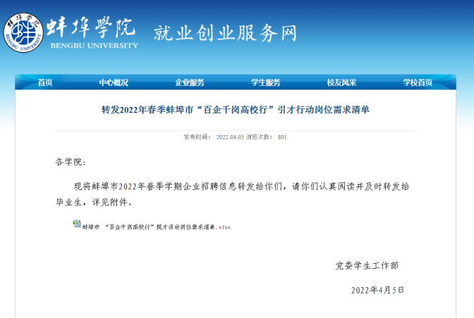 4月6日,学校下发了《关于积极引导毕业生留蚌就业的通知》,要求各二级学院要成立工作专班、及时报送方案、做好专题宣讲、尽早落实走访,促使毕业生对蚌埠本地企业能够“心有所念、行有所向”,自发、自愿、自主留蚌。