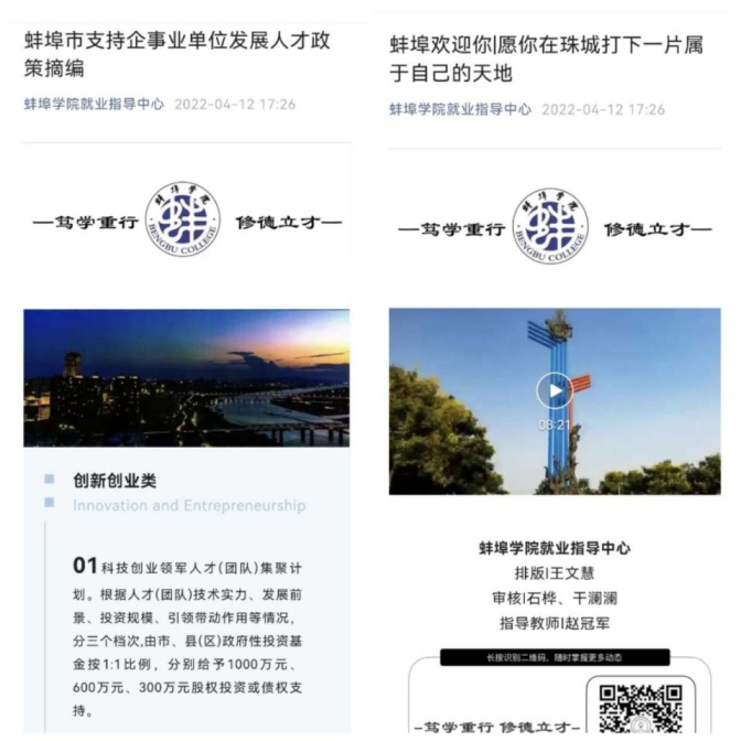 4月12日,学校面向全体毕业生下发了《留在蚌埠 安在珠城:关于引导毕业生本地就业的倡议书》,从蚌埠市人文、区位优势、产业结构、人才政策、生活环境等方面对毕业生进行了较深入的讲解,晓之以理、动之以情,站在毕业生成长成才和个人发展的角度,向毕业生做了一次精心的、诚恳的倡议。同时通过就业网、就业工作群、就业宣传员群、2022届毕业班辅导员工作群、微信公众号等媒体平台,对于蚌埠市的“引才政策”“城市宣传片”进行反复推送。