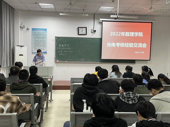 为激发学生考研热情,做好考研学生的“传帮带”。4月28日晚6:30,数理学院光电工程专业考研经验交流会暨22届光电工程专业毕业生考研动员大会于G103教室开展。数理学院光电工程专业负责人宫昊、辅导员杨子希、2018级上岸学生代表及2019、2020级光电专业学生参加了此次会议。
