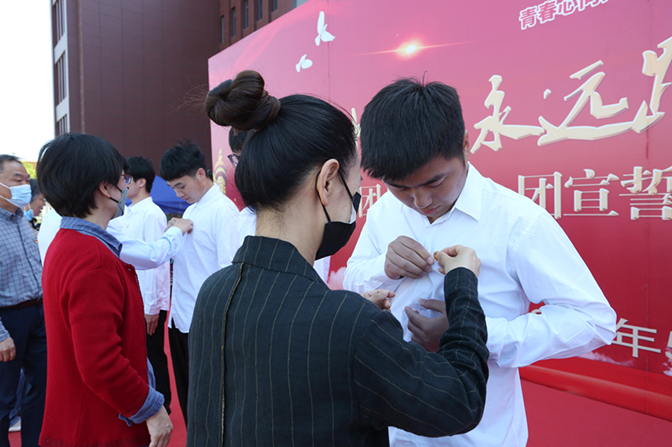 大会在庄严的国歌声中拉开序幕,随后30名新团员代表在安徽省优秀共青团员孙艳的带领下,庄严宣誓,用他们铿锵有力的誓言表达了成为一名共青团员的责任与担当。宣誓后,各学院党委书记为新团员代表佩戴了团徽,并颁发了团员证和团章。