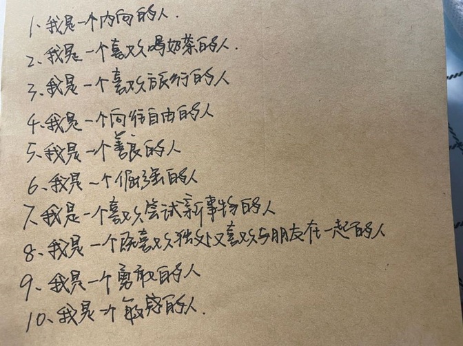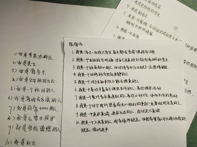 活动采用游戏的形式,要求大家在几秒钟的时间内写下10个“我是…”的句子。在心理咨询老师的指导下,每个人都积极参与,在纸上写下自己对自己的看法。在场同学进行互动交流。有的同学写到我是一个目标明确的人、有耐心的人、性格安静的人,有的同学写到我是一个喜欢尝试新事物的人、勇敢的人。不同的人有不同的答案,每个答案都体现了个人鲜明的特征。一个简单的方法,几个简单的句子,帮助大家认识自己眼中的我及心中的我。