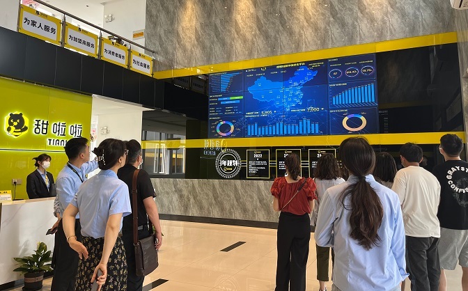 师生党员在人事部主管李技斐等5人的带领下,参观了安徽汇旺餐饮管理有限公司(甜啦啦总部)的市场运营办公室、线上运营直播间、公司产品研发基地等,李技斐详细地向师生党员介绍了公司的发展历程、实体规模、运营机制、企业文化等,并表示在之前的“校企合作 共谋未来”专项行动中同经济与管理学院在电商运营模式、党建双创等领域已经达成初步共识。