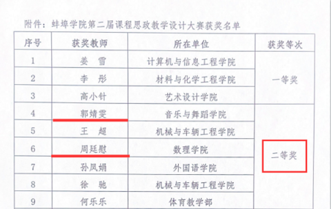 6月2日,民进支部主委、龙子湖区政协委员周廷慰,致公党党员、龙子湖区政协委员郭靖雯等多位教师不忘育人本职,积极承担“课程思政”的主体责任,在《蚌埠学院第二届课程思政教学设计大赛》中取得二等奖的好成绩。(撰稿:钱尔红;编辑:毛星懿;审核:杨安升)