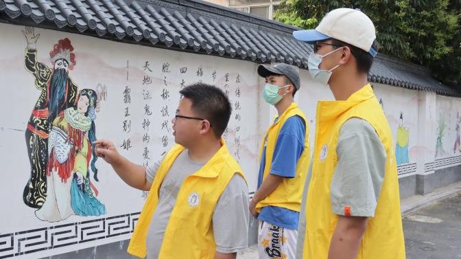 6月21日上午9时,泗州戏小分队在蚌埠学院图书馆二楼集合,查询泗州戏相关资料并讨论在实践中可能会遇到的问题及解决办法,为进行实地调研做足了充分准备。6月22日上午8时,小分队在约定地点涂山路“艺苑巷”集合,开展泗州戏实地调研活动。在实地调研过程中,小分队走进“艺苑巷”,放眼望去,整条街巷都是白色的墙面,青黛色的小瓦。沿东墙向北行,眼之所见,是泗州戏的起源、代表人物等,一点一滴见证了“泗州戏”发展历程;西墙则展示了民间泗州戏文化,通过周边一代又一代居民的传唱,不断演变,直至形成如今的泗州戏板腔体系——“拉魂腔”。随后,小分队对其老住户进行了街头随机采访,从采访中了解到泗州戏发展遇到的困境,这使得队员们与被采访者之间有了更深的情感共鸣,拉进了队员们与泗州戏之间的距离,也坚定了队员们弘扬泗州戏文化的信念。