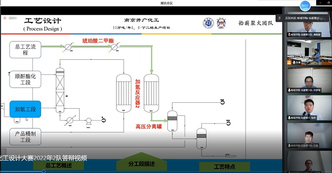 全国大学生化工设计竞赛是国内化工专业级别最高、参赛队伍最多、影响最大的学科竞赛,共有来自全国七大赛区415所高校的2939支队伍、14600余名学生参赛。此次大赛设计题目为:为某大型化工企业设计一座1,4-丁二醇生产分厂或为现有的1,4-丁二醇生产分厂设计技术改造方案,要求符合我国绿色低碳的发展要求。材料与化学工程学院从2021年12月遴选队员、组织队伍到下发任务书直至完成作品提交历时八个月,在教师刘沐鑫、秦英月、李良和石春杰的指导和组织下,经过可行性探究、产品选定、工艺路线选择、任务分配、软件模拟、绘制图纸和文档撰写等环节,期间克服了新冠疫情带来的不利影响,在华中赛区初赛中三支队伍分别名列第92、127和166位。在华中赛区决赛中,“拾薪聚火队”与来自合肥工业大学、武汉理工大学、郑州大学和南昌大学等参赛队伍同台竞技,最终凭借优秀的设计方案和出色的演讲与答辩,获得全国二等奖。